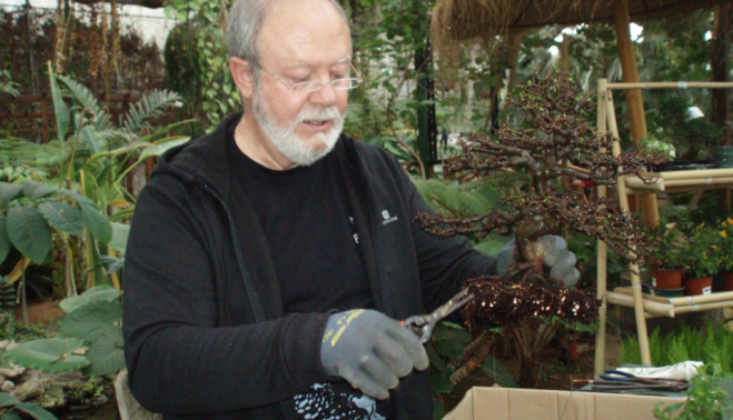 Bonsái significa "árbol que crece en bandeja". De origen chino, muchos creen que es japonés, ya que Japón le saca grandes beneficios económicos debido a la akadama, un sustrato vital para que estos árboles en miniatura perduren años. China y La India son los dos países creadores de estas maravillosa, así que todo se queda en el continente asiático. Pero la tradición de cuidar de estas plantas leñosas se va expandiendo poco a poco alrededor del mundo desde hace ya mucho tiempo. El jerezano Jerónimo Campoy Muñoz, gerente de Piscinas Jerez desde 2013, es uno de los mayores aficionados a esta artesanía. Nace en agosto del 53 y dice que el interés por las plantas le viene desde pequeño, ya que en la Barriada España, donde se cría, su madre cultiva un jardín que él trata con especial mimo. Este amante de los bonsáis conoce desde hace 20 años todo lo que debe saber sobre esta especie a través de internet y revistas especializadas. Pero no llega a dedicarse a ello hasta que en 1999 compra una casa con una terraza de 140 metros: “La he destinado prácticamente al bonsái”, indica.