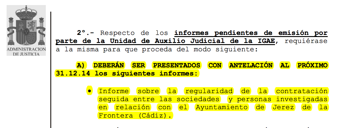 En la nueva providencia emitida por Ruz, a la que ha accedido La Voz del Sur gracias a losgenoveses.net, el juez instructor manda y firma: "Respecto de los informes pendientes de emisión por parte de la Unidad de Auxilio Judicial de la IGAE, requiérase a la misma para que proceda del modo siguiente: deberán ser presentados con antelación al próximo 31.12.14 los siguientes informes: Informe sobre la regularidad de la contratación seguida entre las sociedades y personas investigadas en relación con el Ayuntamiento de Jerez de la Frontera (Cádiz)". En el encabezamiento de la providencia, el magistrado deja claro la necesidad de estos informes "al objeto de agilizar la instrucción en curso" y pone plazos muy concretos porque se trata de un "contenido indispensable para el avance de las actuaciones". De las cinco peticiones de informes que hace en la providencia, señala dos (entre ellas Jerez) con mayor premura. Y advierte finalmente: "Hágase mención en la totalidad de oficios y requerimientos a la necesidad de que los plazos previamente indicados sean atendidos por las diversas Unidades destinatarias de aquéllos, y sólo para el caso de concurrir causa justificada que motivara un retraso o demora en cuanto a la presentación de los informes interesados, deberá ser puesta en conocimiento del Juzgado con la suficiente antelación, a fin de que pueda ser valorada por este instructor". A la espera, pues, de lo que diga la valoración e informe de la IGAE, lo que sí es evidente es el interés del magistrado por cerrar la instrucción en Jerez, que además encerraría la complejidad añadida de tener que acordarse, en última instancia, la inhibición del tribunal competente” por la condición de aforada de la también senadora popular, a la que solo podría calificar como imputada el Tribunal Supremo.
