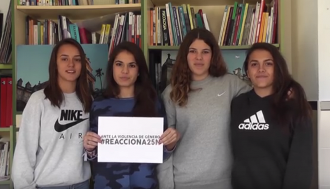 "Ante la violencia de género, ¡reacciona", gritan al unísono miembros de la AMPA del centro, que también protagonizan la campaña. "Aunque tendría que haber salido el 25 de noviembre hasta ahora no sido posible, pero bueno en realidad contra la violencia de género no hay que trabajar un dia, sino los 365 días del año", señala Geli Sánchez, presidenta de la AMPA del IES Seritium.