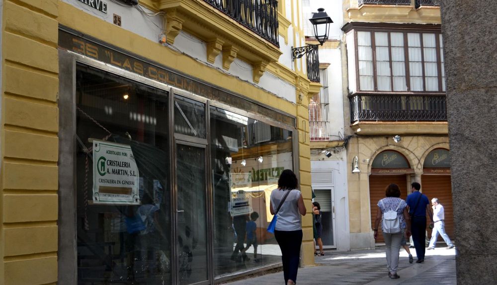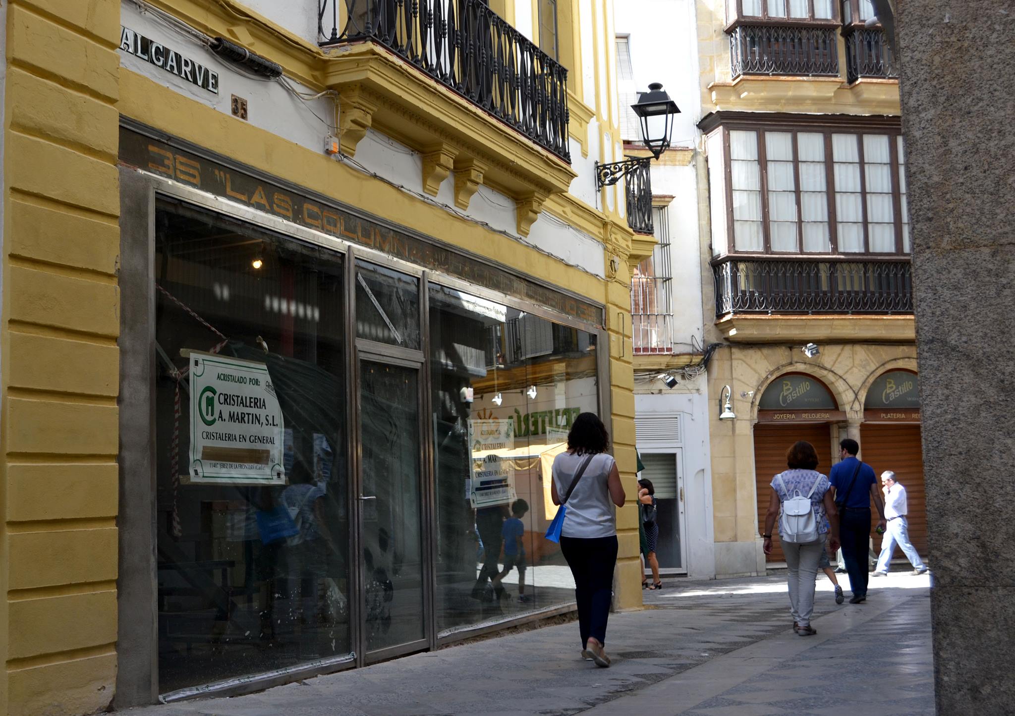 Poco queda ya de lo que hasta hace algunos años era Confecciones Anguita. El nuevo tabanco Plateros contará con una enorme cristalera, que dará mayor luz al local y, por ende, le dará mayor vida. Si en su actual lugar la clientela, más que el interior busca su terraza, esto es precisamente lo que le faltará en Algarve, de ahí este nuevo concepto que buscan sus propietarios. Los arreglos en la fachada, además, han sacado a la luz un antiguo cartel que reza "Las Columnas", sin que este medio haya podido saber qué tipo de negocio se trataba ni su antigüedad.