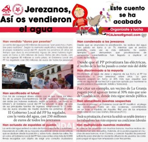 Las consecuencias derivadas de la privatización del agua empiezan a ser evidentes en nuestra ciudad. Es por ello que el PCA Jerez ha lanzado una campaña informativa, titulada Así malvendieron tu agua, con objeto de repasar las claves del oscuro proceso de privatización del servicio y explicar, de forma gráfica y sencilla, las consecuencias de privatizar, a cambio de 80 millones de euros, un servicio que hubiera generado durante el tiempo que permanecerá en manos privadas más de 300 millones de euros.