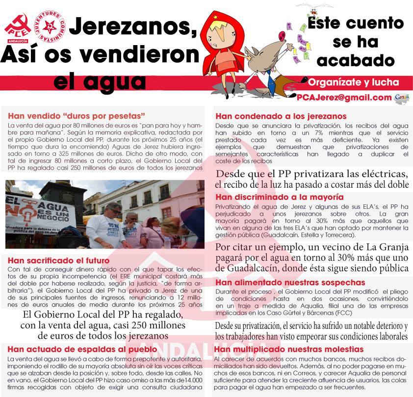 La campaña lanzada por el Partido Comunista, como parte integrante de la Coordinadora para la Defensa de la Gestión Pública del Agua y con la colaboración de ésta, ha comenzado con el reparto de casi 4.000 dípticos informativos y tendrá continuidad a través de las redes sociales con la difusión viral de diferentes archivos de imagen (como el que acompaña esta información) con un resumen del proceso y, sobre todo, de las consecuencias de éste para los bolsillos de los jerezanos. Con esta campaña, el PCA Jerez "pretende evitar que caiga en el olvido una de las mayores infamias cometidas por el gobierno local del PP durante la presente legislatura".