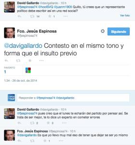Espinosa, que en las pasadas municipales de 2011 fue en la lista como 'número 2' del candidato de UPyD, Martín de la Herrán, llegó a mantener una conversación con un periodista jerezano en el que éste le pedía directamente que se retractase de sus desafortunados comentarios. "quillo, esos comentarios no son propios de un dirigente político", le respondía @davigallardo. A lo que el dirigente de UPyD Jerez mantenía: "Cierto, pero a veces no tengo ganas de aguantar según qué cosas... Y seguía la réplica: "Pero el Tuiter no es el sitio, y menos con esas formas. Relee lo que has escrito". "Pues nada de lo q arrepentirme David...", mantenía, a lo que su interlocutor le insistía: "si no te arrepientes de ese lenguaje y esas formas, mañana o tienes que abandonar la política o tienen que echarte del partido. Y mira que cometo errores por aquí, pero yo no soy político". "Es que yo llevo muy mal eso de tener que dejar se ser yo mismo", zanjaba sorprendentemente Espinosa.