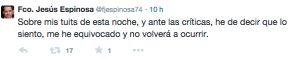 Para rematar la noche y el lío, y viendo que el incendio iba a más, el representante en Jerez de UPyD dejó claro que "no tengo intención de representar a nadie", cuando le sugirieron que no era normal ese tono y ese lenguaje como ejemplo ante los ciudadanos a los que pretende representar. En cualquier caso, horas después, Espinosa trató de dar carpetazo al entuerto con un último tuit en el que escribía, al estilo del Rey abdicado: "Sobre mis tuits de esta noche, y ante las críticas, he de decir que lo siento, me he equivocado y no volverá a ocurrir".