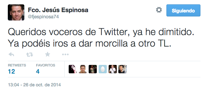 Francisco Jesús Espinosa, 'número 2' en las últimas elecciones y que se rumoreaba que aspiraba a ser candidato a la Alcaldía en 2015 por la formación magenta, tropieza gravemente tras desatar las iras catalanistas y contestar con insultos e improperios en esta red social. Horas después del lío dice "sentirlo" y que "no volverá a ocurrir". Esta misma mañana asegura en otro tuit que se tergiversaron sus palabras y anuncia su dimisión