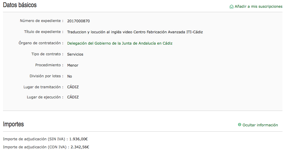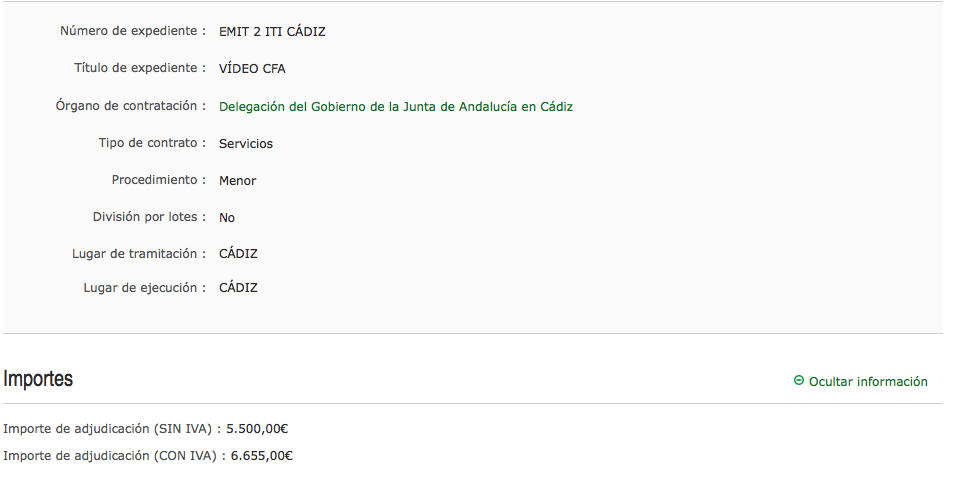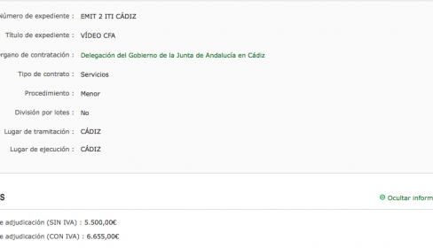 Con todo, para lo que sí ha habido tiempo desde aquel protocolo ha sido para contratar un vídeo promocional sobre las bondades de un proyecto que, a día de hoy, está muy lejos de ser realidad. A finales de 2016, mediante contrato menor, la Junta de Andalucía en Cádiz adjudicaba la edición de un vídeo promocional del futuro Centro de Fabricación Avanzada gaditano por un montante de dinero público de 6.655 euros, cantidad que se incrementaba en 2.342 euros más al añadir un nuevo contrato menor para la traducción y locución al inglés de esta promo. En total, unos 9.000 euros para un trabajo que se publicó en septiembre de 2016 en el portal que la Junta en Cádiz tiene en YouTube y que apenas cuenta con 1.400 visualizaciones desde entonces.