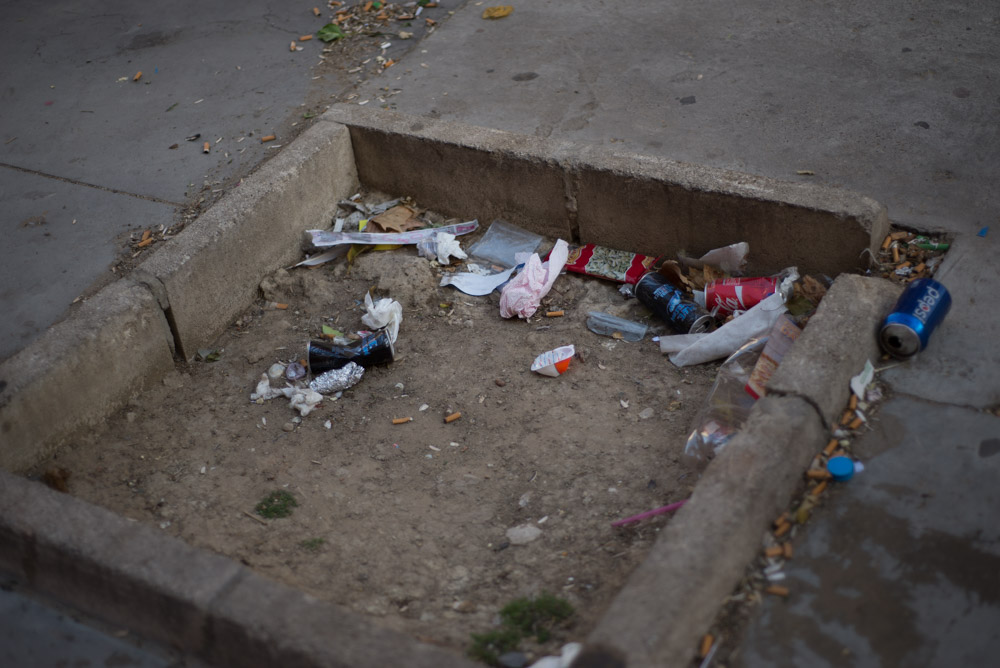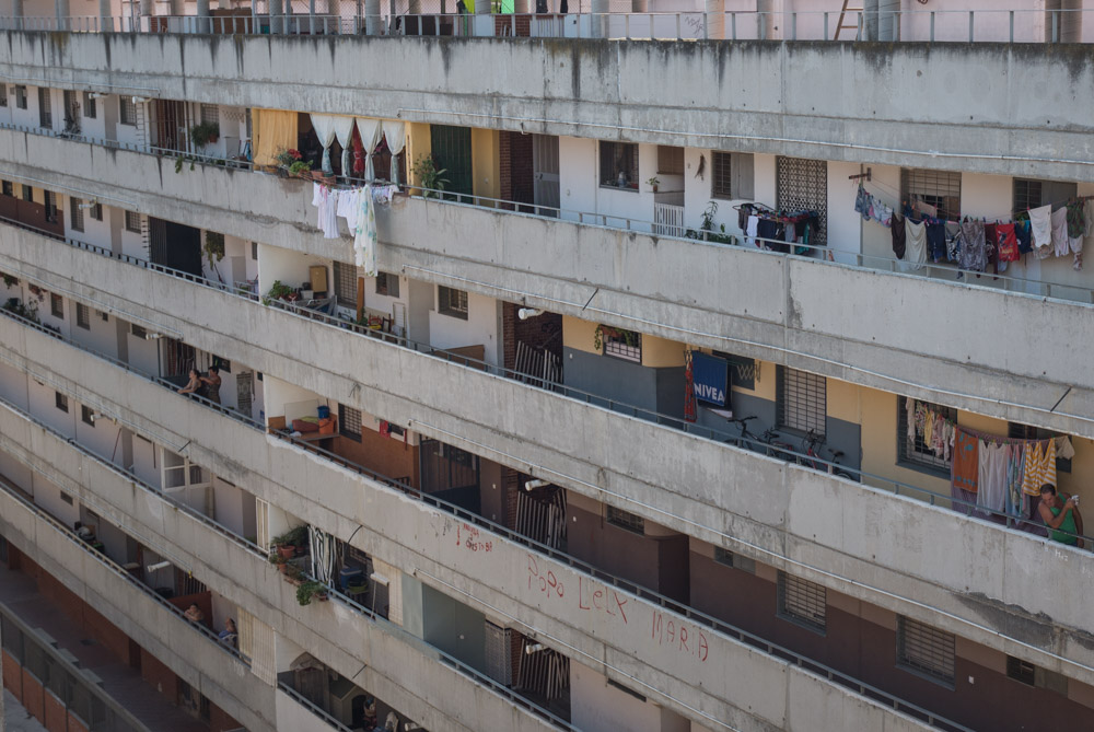 La conversación con Pepe se desarrolla en las desgastadas escaleras de acceso a los bloques. Está claro que por aquí se hacen pocas obras de mejora. De las últimas, unas canalizaciones de aguas fecales que dejaban enormes y pestilentes charcos, aunque el mal olor en según qué partes de la barriada sigue persistiendo. “Las pocetillas… Hasta que la mierda no llega hasta arriba no vienen a desatascar”, nos dicen. Da incluso la sensación de que la obra exterior de los edificios no se llegó a terminar, viendo su basto acabado. También vemos una veintena de alcorques que nunca han acogido árboles, pero que actualmente son una trampa para despistados –“cada dos por tres hay alguien en el suelo”- además de ser improvisadas papeleras, teniendo en cuenta de que no hay ni una en toda la plaza. “Aquí pasa el barrendero una vez a la semana”, critica un grupo de vecinas. Efectivamente, los alcorques están llenos de latas, papeles y colillas. El suelo también presenta enormes manchas. “Si a mi hija se le cae el chupete directamente lo tiro, esto es un foco de infecciones”, afirma Jessica, otra ‘pasajera’ del Titanic. “Aquí cada cual se limpia su puerta, porque si no la porquería nos llegaba hasta las rodillas”. Las ratas, las cucarachas y los murciélagos son otros compañeros de viaje en los bloques. “Aquí solo han fumigado una vez, y no se podía salir de cómo estaba todo de cucarachas muertas”.