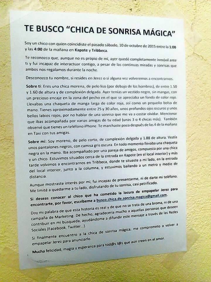 Afirma haberse enamorado de una chica "de sonrisa mágica" que vio este pasado fin de semana en dos discotecas de Jerez. Cómo sería ella que se quedó "completamente inmóvil" e "incapaz de interactuar" con ella a pesar "de las continuas miradas y sonrisas que ambos nos regalamos durante la noche".