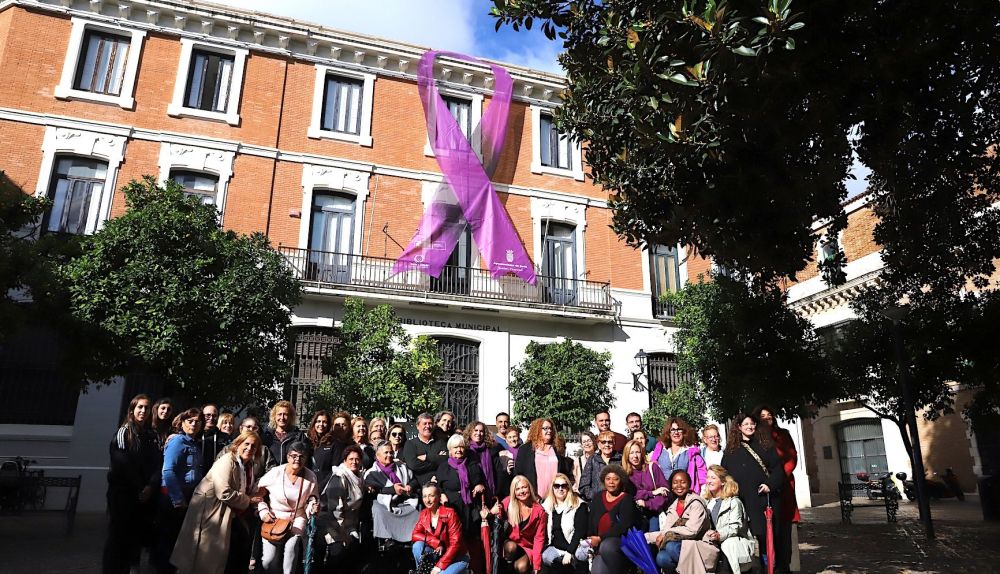 En el acto han participado la teniente de alcaldesa de Igualdad, Susana Sánchez Toro, junto a miembros de la Corporación, el delegado territorial de Inclusión Social, Juventud, Familias e Igualdad, Alfonso Candón; la coordinadora en Cádiz del Instituto Andaluz de las Mujeres, Blanca Merino; la vicepresidenta del Consejo Local de las Mujeres, Coral García Gago, y representantes del tejido asociativo de la ciudad. Todas estas personas han tomado parte en este gesto simbólico de fijar el lazo morado en la fachada, como recordatorio del apoyo incondicional del Ayuntamiento de Jerez en la lucha contra la violencia hacia la mujer.