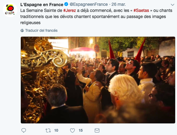 La Oficina Española de Turismo en Francia, con más de 27.000 seguidores en Twitter, publicó en la tarde de este pasado Martes Santo un tuit dedicado a las saetas, una de las máximas expresiones del cante jondo relacionada con la Semana Santa y para ello citó a Jerez, sin duda una de las cunas del flamenco y donde este palo, por seguiriyas, alcanza grandes niveles de interpretación de la mano de algunos de los mejores cantaores de la tierra.