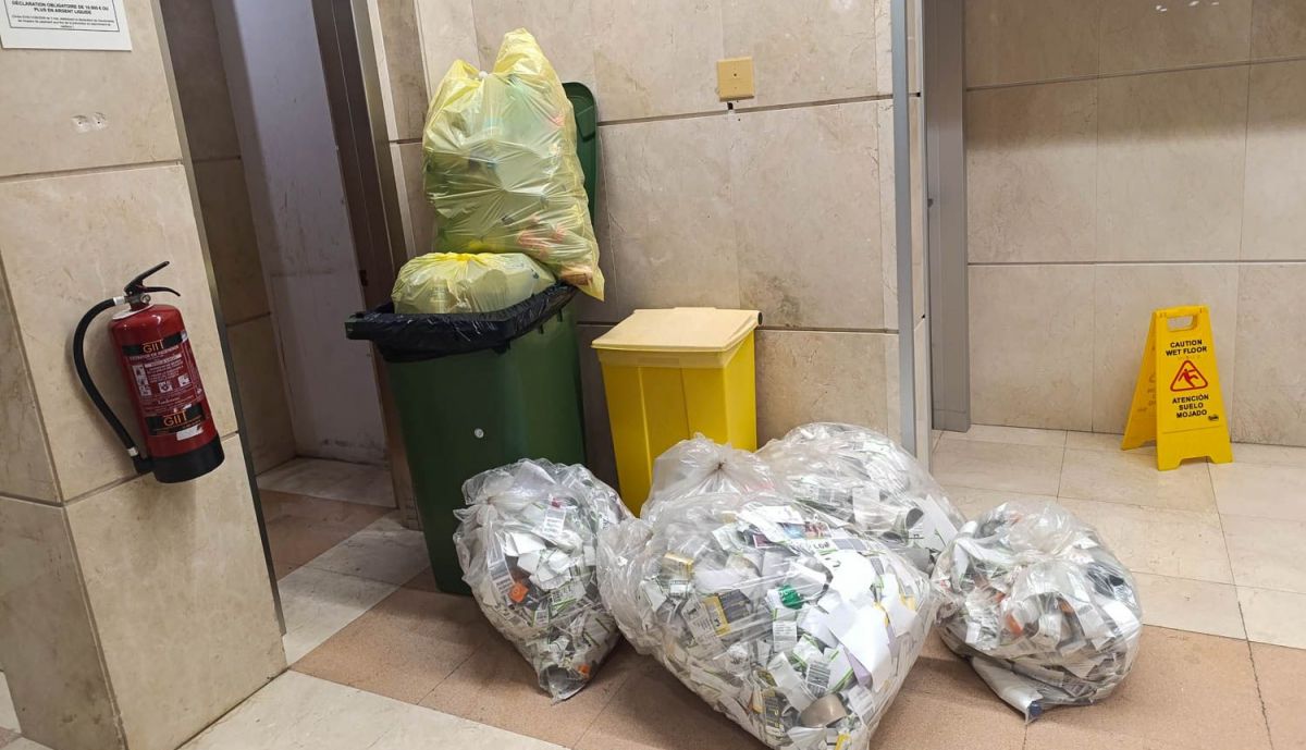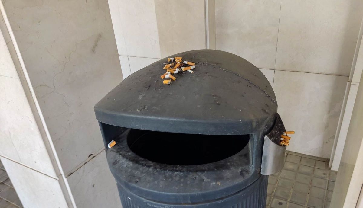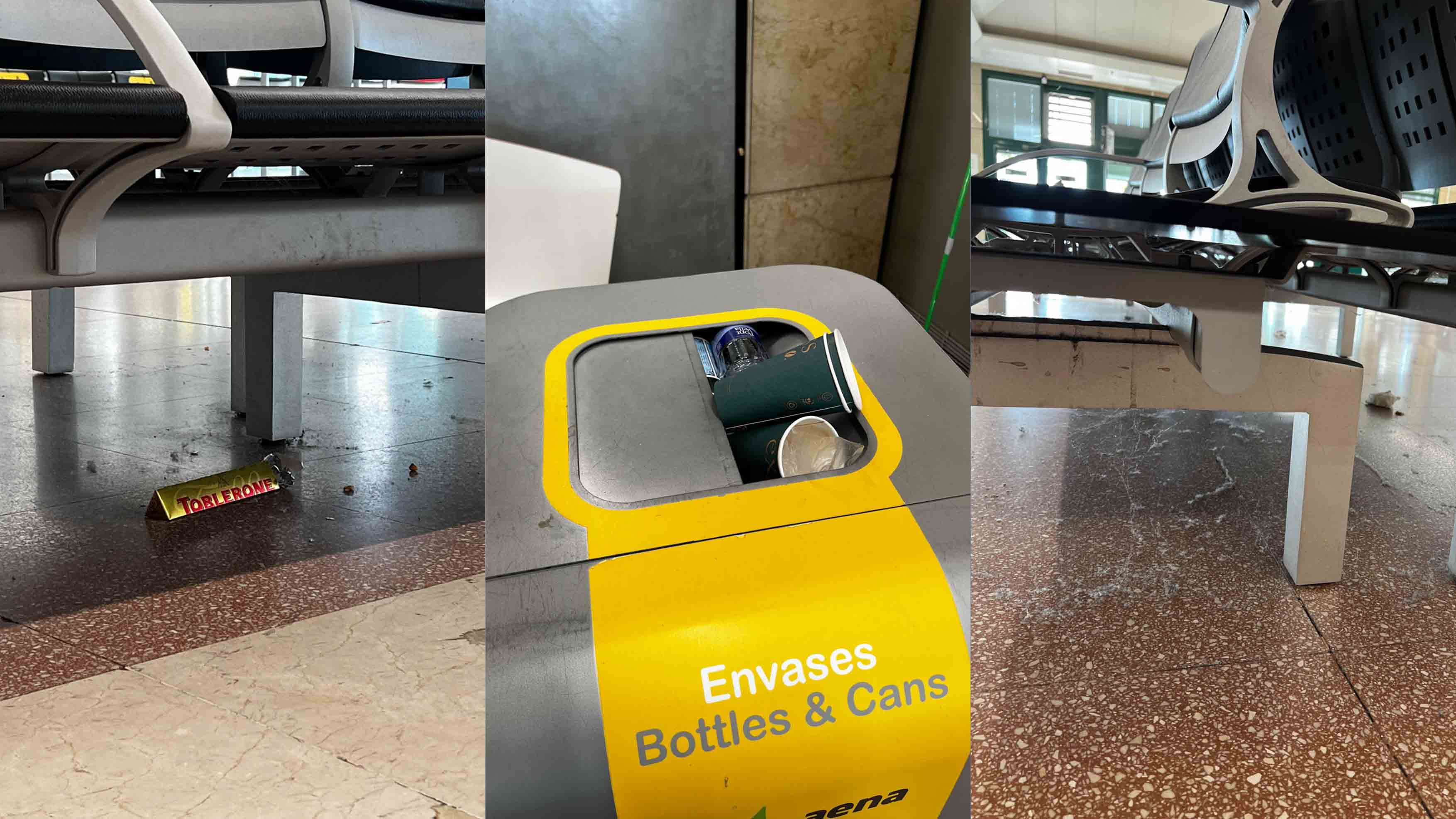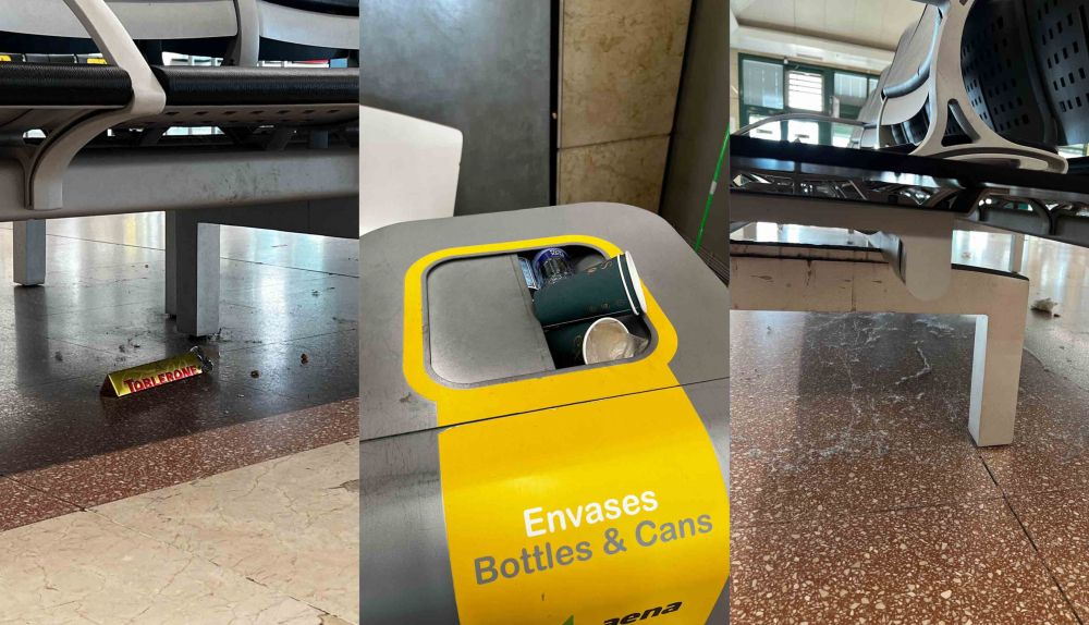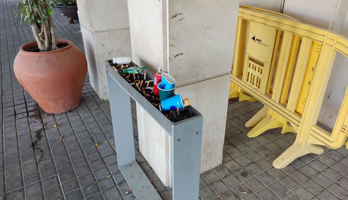 Pero no es el único problema. Porque en servicios, en estética, está dejando mucho que desear. El aeropuerto está hecho una auténtica 'cochambre' por falta de limpieza. Ya en el exterior, a menudo se acumulan colillas en las papeleras, pero también por fuera de ellas, donde además se ven papeles y envoltorios tirados.