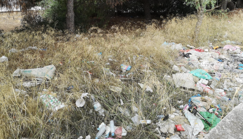 Bolsas, latas, botellas, papeles, envases… se acumulan a montones en lo que debería ser una zona verde y que se encuentra a la espalda de un complejo sanitario del SAS en la ciudad.