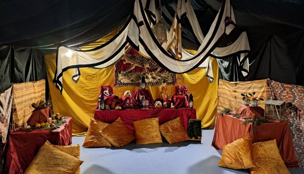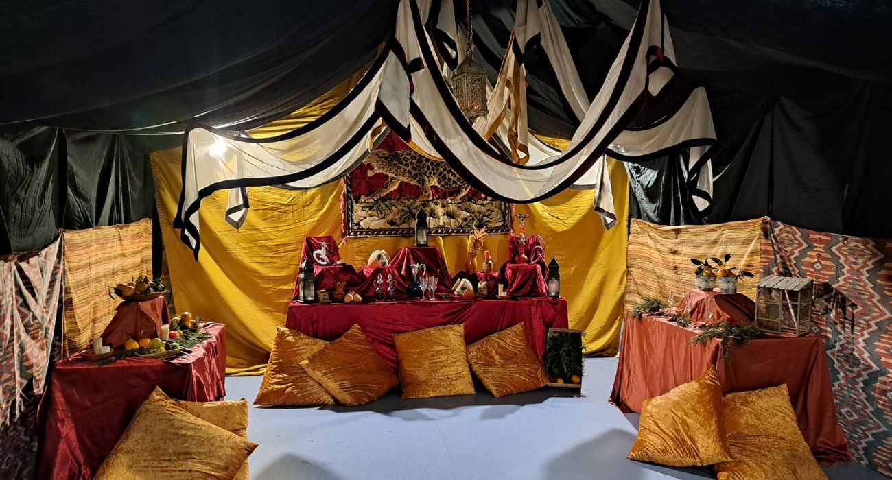 No falta ningún detalle en esta particular tienda de campaña que acogerá durante unas horas a los magos de Oriente, que repartirán regalos entre el alumnado del Antonio de Nebrija.
