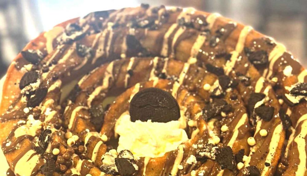La referida pizza-porra sale por 6,50 euros y es de un tamaño bastante considerable. Pero, además de este goloso dulce, en El Bodegón 3 también puedes encontrar desayunos especiales y, entre crepes, gofres y otras delicatessen, un churro relleno de Kinder Bueno que "tiene una pinta exquisita y una presentación extraordinaria".