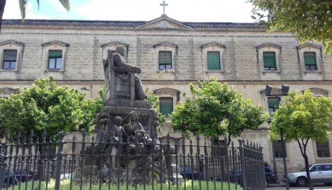 Bajo su sombra y amparándose en ella —pues da soporte y es coartada de todos cuantos defienden la desigualdad sustentando su argumento en el supuesto poder que emana de un Dios invisible e intangible— y casi en el mismo régimen de igualdad está el mejor ejemplo del arte escultural que retrata a la más burguesa y capitalista de las oligarquías locales, talla que sirve como exégesis de las bondades de las plutocracias jerezanas y españolas —tanto monta, monta tanto para cualquier otra ciudad—, expresión de un burgués millonario a caballo entre el XIX y el XX, y que por culto e ilustrado, es remordido y caritativo y se desprende donosamente de sus dádivas y limosnas a modo de regalo graciable y desinteresado a los pobres de solemnidad.
