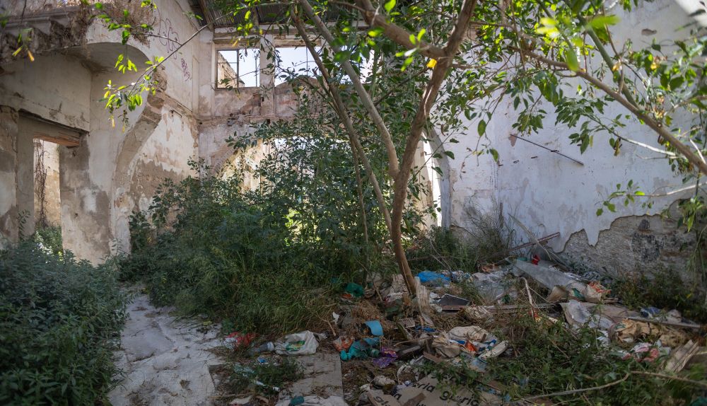 Desde la parte de atrás de la finca se ve cómo la naturaleza se ha hecho fuerte entre la ruina. Sin embargo, basura acumulada y escombros darán paso a maquinaria de construcción para rehabilitar el inmueble y convertirlo en hotel de cuatro estrellas y 67 habitaciones en pleno centro de Jerez, entre Bizcocheros y Larga.