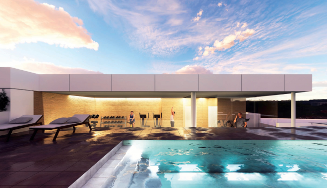 La promoción se completa con 33 plazas de garaje; 15 trasteros; gimnasio y una llamativa piscina y solárium en la planta alta del edificio.