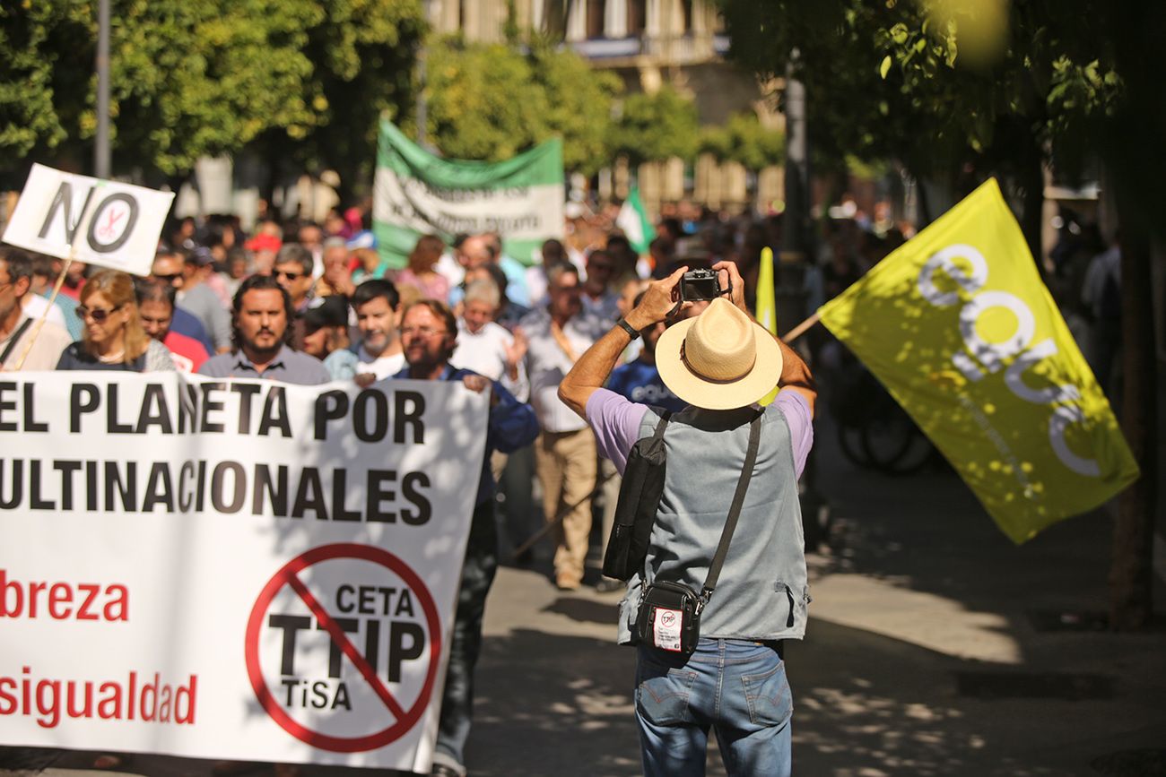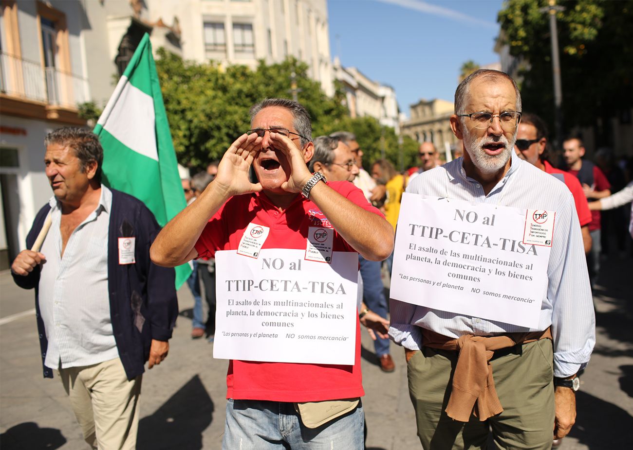 "La gente que está en la calle no tiene ni idea de qué significa todo esto", mantiene Luis Miguel Garrido, miembro del círculo ambiental de Podemos en Cádiz. Junto a él, camina el conocido abogado laboralista colombiano Hugo Gómez: "Esto significa poner todo al servicio del gran capital y las decisiones concentradas en manos de los monopolios determinados. Esto va contra la política, supedita toda la política económica a los intereses imperialistas que hacen y deshacen". La campaña estatal No al TTIP ha organizado cerca de 80 actividades en 14 comunidades autónomas entre los pasados 8 y 15 de octubre, cerrando su semana de movilizaciones con las manifestaciones de este sábado. En Jerez, epicentro de la movilización provincial, ha estado la parlamentaria andaluza de IU, Inmaculada Nieto, quien ha reclamado "un tratamiento de las personas como ciudadanos, no como meros clientes o consumidores de multinacionales, que es lo que está garantizándose a través de gobiernos oscuros que no dan participación en las relaciones futuras de la UE con países como EEUU y Canadá". Relaciones que, a su juicio, "son peligrosas, por ejemplo, para las garantías alimentarias ya fijadas en Europa, para los derechos de los trabajadores... y que nos colocan en una posición muy vulnerable".