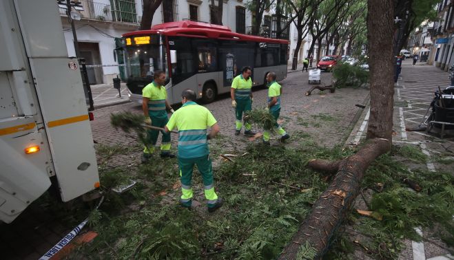 El Ayuntamiento de Jerez se encuentra trabajando a marchas forzadas este lunes para paliar las consecuencias del temporal que azotó el domingo a la ciudad. Una situación que se complicó debido a la falta de agua del último año, a las primeras lluvias del jueves y a rachas de viento que de más de 100 km/h. Así, la debilidad de los árboles en las raíces se unió a que las primeras lluvias habían generado barro en horas anteriores. Por eso, muchos árboles cayeron de cuajo, al completo, desde la raíz.