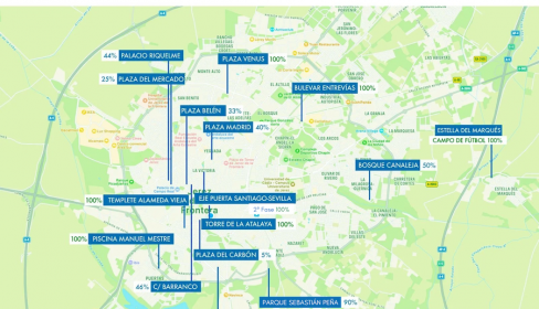 También están en marcha la incorporación de zonas de arbolado y sombra en la que hasta ahora era la ‘plaza dura’ o ‘isla de calor’ de Plaza Belén (al 33% de ejecución, 154.000 euros de inversión); mientras que el nuevo campo de fútbol de Estella del Marqués ya fue inaugurado hace un par de meses, contando con 385.234 euros de presupuesto financiado por el propio Ayuntamiento de la ELA y la Diputación de Cádiz.