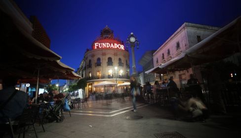 El histórico luminoso de Bodegas Fundador, cuyas letras habían desaparecido de forma temporal, han vuelto a lucir en lo alto del emblemático edificio del Gallo Azul, situado en el centro de Jerez.