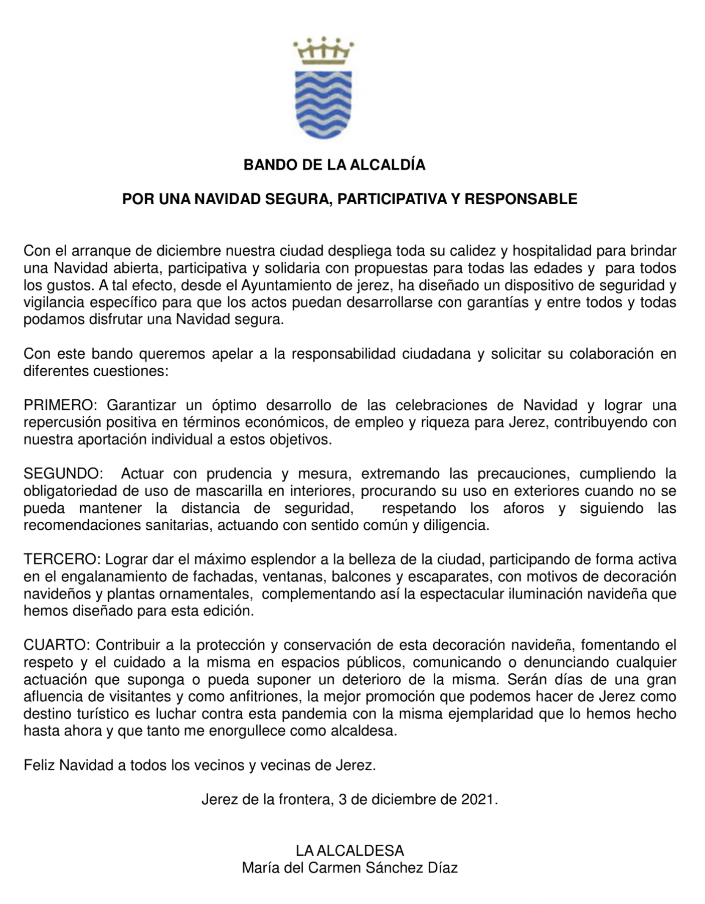 Este es el Bando del Ayuntamiento de Jerez mediante el que se pide responsabilidad ante las fiestas de Navidad