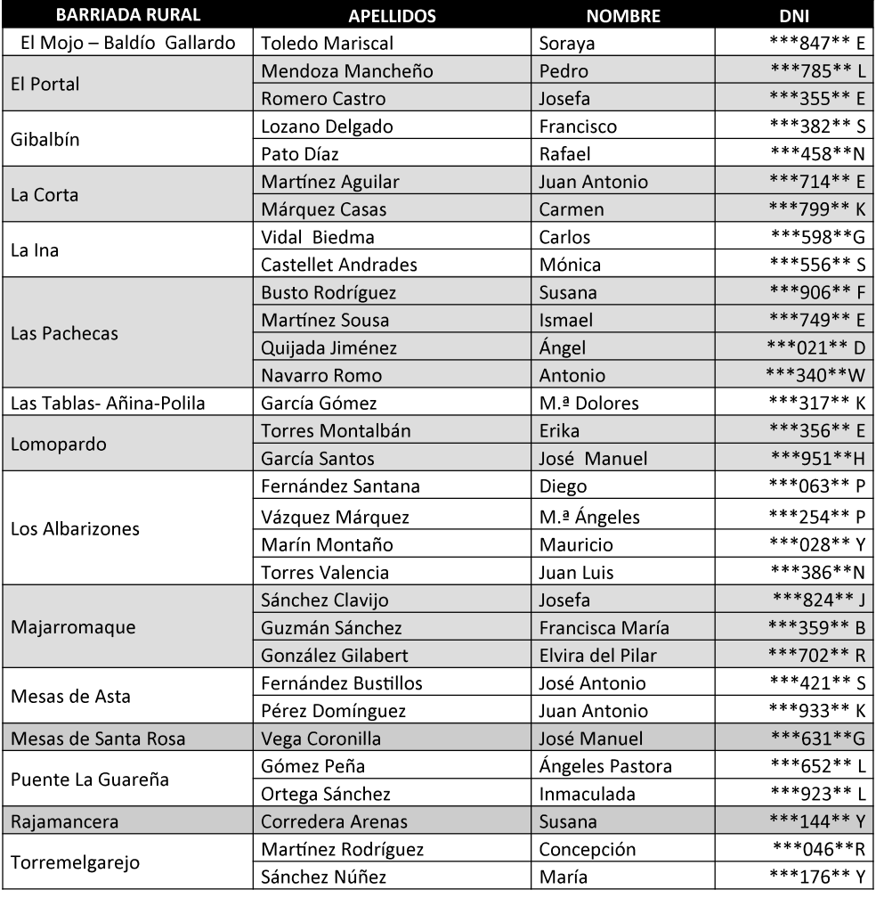 Como curiosidad, cuatro candidatos de otras tantas barriadas rurales ya han ganado sin celebrarse elecciones en sus núcleos rurales, ya que son las únicas candidaturas en liza que se han presentado. Soraya Toledo (El Mojo-Baldío Gallardo), María Dolores García (Las Tablas, Polila, Añina), José Manuel Vega (Mesas de Santa Rosa) y Susana Corredera (Rajamancera), se presentan sin adversarios en las urnas.
