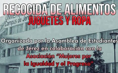 La Asamblea de Estudiantes de Jerez, en coordinación con la asociación Mujeres por la Igualdad y el Progreso, reliza una recogida de juguetes y alimentos destinada a familias de la ciudad el próximo martes 15 de diciembre, a las 14:30, en el Campus de Jerez.