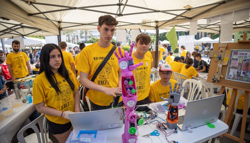 “¿Te gustan los experimentos?”, le pregunta un profesor a una alumna. Ella asiente mientras varios compañeros hacen pompas de jabón, otros dan vida al laboratorio vinícola y otros descubren cómo observar las estrellas. Las camisetas amarillas han tomado la Plaza del Arenal de Jerez, donde numerosos grupos de estudiantes de distintas edades abren sus mentes ávidas de conocimiento. En la Feria de la Ciencia en la Calle, que celebra su XII edición hasta este jueves 18 de abril, los más mayores explican sus experimentos a los más pequeños, y viceversa.