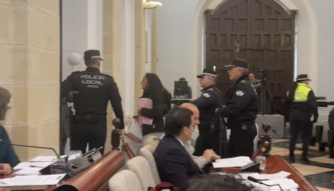 La jerezana Yumara Santiago de los Reyes ha sido expulsada del pleno municipal celebrado este jueves en el Ayuntamiento de Jerez. Lleva meses demandando una vivienda de emergencia que asegura que las autoridades le prometieron antes de las elecciones municipales. Sin embargo, no recibe una solución y ha decidido irrumpir en el salón con una pancarta en la que explicaba que ella y su pequeño fueron desahuciados de su última casa.