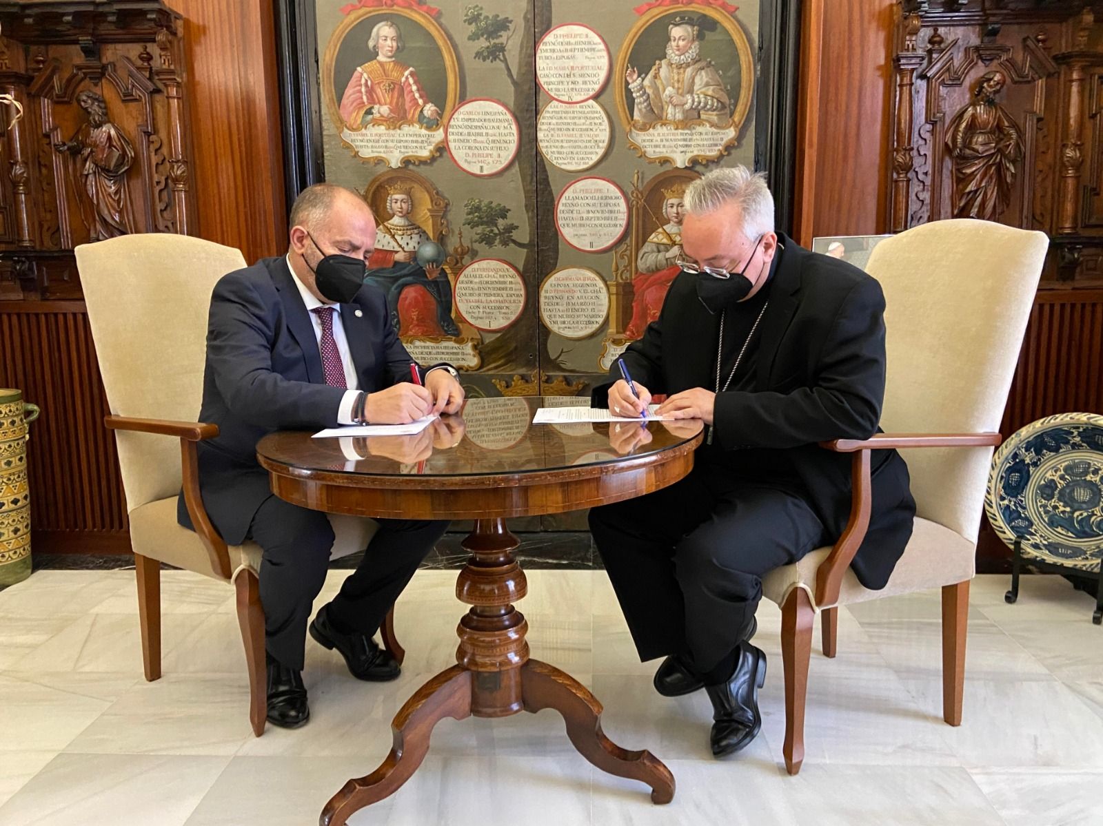 Este martes ha tenido lugar en la sede del Obispado la firma del acuerdo entre la Iglesia Asidonense, representada por monseñor Rico Pavés, con Fulgencio Meseguer, documento que da validez a esta restauración ya que el objetivo es recuperar la fachada original que tuvo la iglesia dedicada al patrón de Jerez.