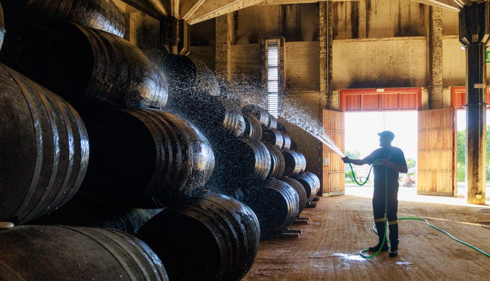 Los vinos también sufren ante el calor intenso, por lo que hay que estar muy pendientes de lo que marcan los termómetros situados de forma estratégica en la bodega. Debido a la gran superficie de Williams & Humbert, que alberga más de 60.000 botas, siendo una de las más grandes de Europa, este riego se hace por zonas, utilizando grandes mangueras que humedecen el piso y botas, provocando un efecto refrescante, “pero se hace siempre teniendo en cuenta la humedad que haya en el aire para que el riego se lleve o no a cabo”, explica Ana Dominguez, capataz de la bodega.