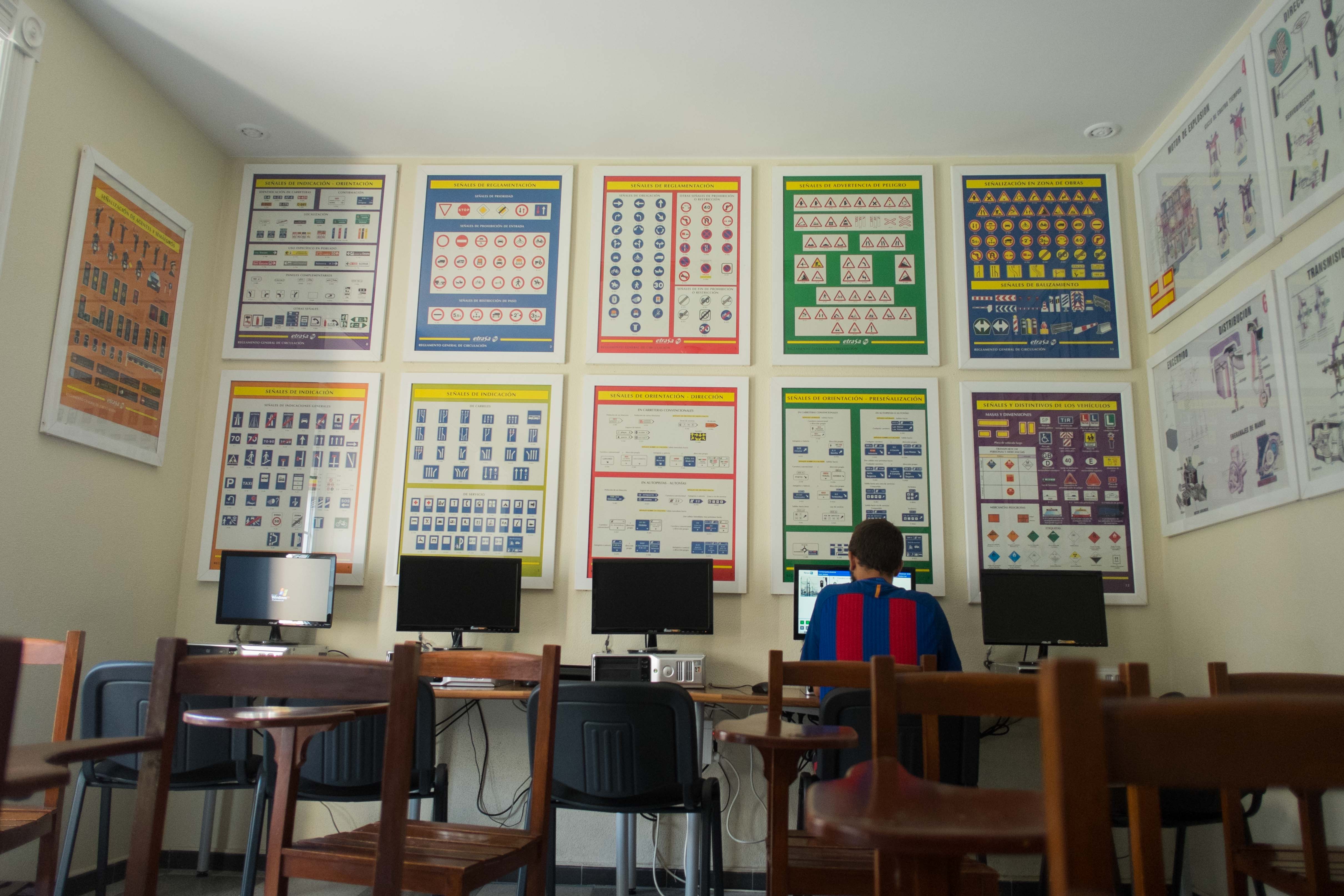 En el número 67 de la calle Larga, pocas cosas han cambiado. La autoescuela mantiene un halo romántico. De hecho, en la única aula se mantiene la vieja pizarra (de pizarra y tiza) y los primigenios pupitres de madera. “Aquí ha venido un anticuario pidiendo precio por ellos”. Hay otros elementos del pasado, como un panel en el que se representa un coche y todas sus luces, aunque Ángel explica que lo adquirió su padre años después de abrir la autoescuela. Solo unos ordenadores, en el fondo del aula, nos devuelven a la realidad y al tiempo actual.Y es que es precisamente internet y las nuevas tecnologías las que han ido cambiando en los últimos años la tradicional manera de entender las clases en la autoescuela. Si antes el alumno realizaba sus test de manera presencial, ahora se les facilita una clave para que puedan hacerlos a través de la red sin moverse de su casa. “Ese trato directo entre alumno y profesor se ha perdido, por lo menos durante la teoría, porque en la práctica obviamente se mantiene. Hoy día ya solo estamos para resolver dudas, el alumno ya busca la comodidad”.