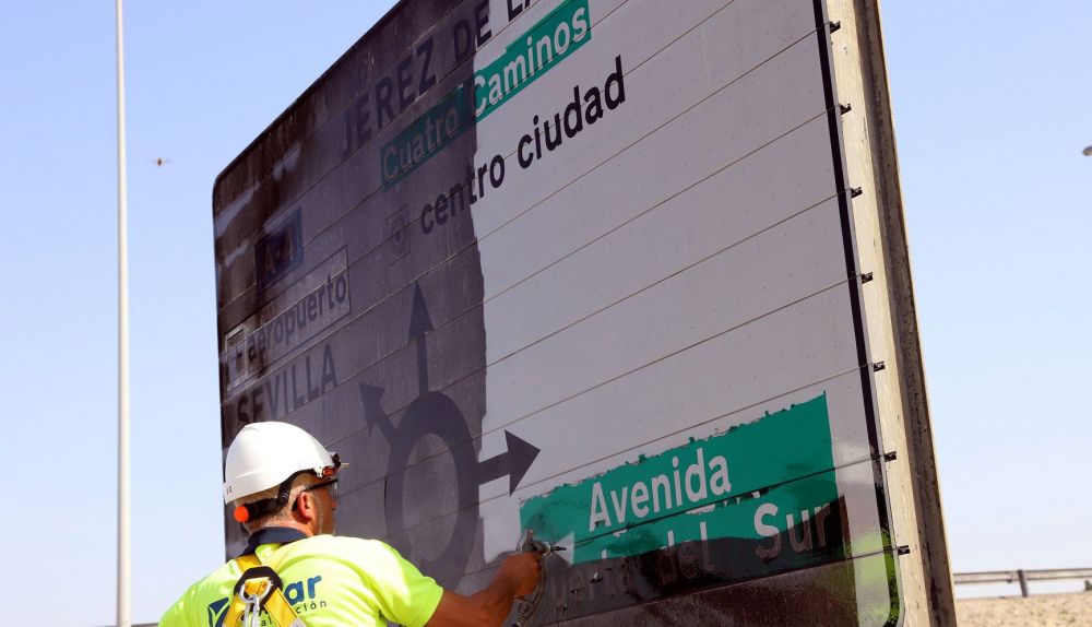 El gobierno municipal de Jerez encara la finalización de las obras de limpieza integral de señales de tráfico y de dirección en las entradas y salidas a la ciudad desde El Puerto de Santa María y Sanlúcar de Barrameda. En los próximos días concluirá la limpieza de los cuatro pórticos direccionales que restaban por limpiar y se proseguirá por las señales verticales de menor tamaño. En la limpieza de éstos se están utilizando máquinas ‘hidrolimpiadoras’ de 180 bares de presión.
