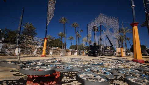 Ahora es el turno del alumbrado. En estos días, la empresa Ximénez lleva a cabo el montaje de las estructuras que darán luz a una Feria que tiene en este aspecto una de sus singularidades. En cuanto al montaje, son muy pocos los caseteros que lo han iniciado. Será desde días antes del puente del primero de mayo, y durante ese mismo día festivo, cuando el parque presente el caos habitual que es inherente a todo este proceso.