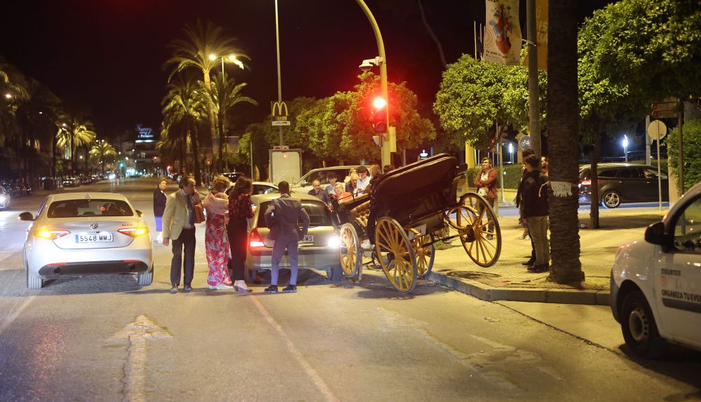 Un coche de caballos que estaba parado en la puerta de la Feria se ha desbocado y ha cabalgado solo por la avenida Álvaro Domecq hasta que se ha estampado contra un turismo. El caballo, tras el impacto, se ha soltado y escapado corriendo hacia el centro de la ciudad.