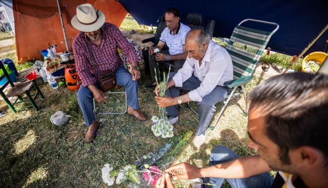 Bajo la sombra de un toldo, sentados en hamacas, varios hombres ya han comenzado a deshojar tallos. Ángel, natural de Navalmoral de la Mata, en Cáceres, acumula 35 años de ferias a sus espaldas. “Aquí ya nos conocemos todos”, comenta el patriarca rodeado de compañeros. “Aquí preparamos los claveles, mira como está todo el suelo de tallos”, dice Santiago, señalando la zona. Este madrileño ya conoce el oficio después de llevar 45 años desplazándose de feria en feria.