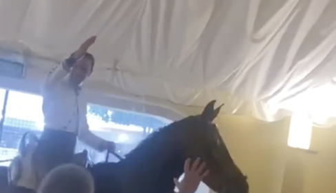La tromba de agua que ha caído este viernes 23 de mayo en Jerez sigue dejando escenas insólitas. Un jinete ha entrado con su caballo en la caseta de La Buena Gente del Real de la Feria del Caballo para refugiarse de las intensas precipitaciones.