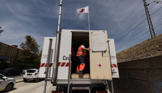 A la entrada de la Calle del Infierno, en la carpa de la Cruz Roja, las ambulancias están preparadas para cualquier emergencia. Una señora se acaba de desplomar en una de las casetas del Real. Algunos sanitarios se montan en el vehículo y pisan el acelerador tras recibir el aviso. Al mismo tiempo, un joven acaba de entrar en uno de los boxes habilitados con una molestia en la pierna.