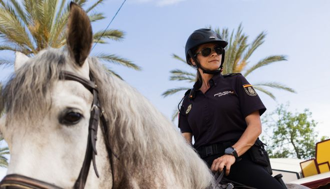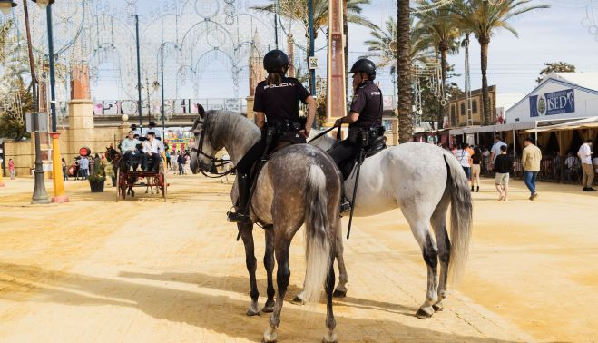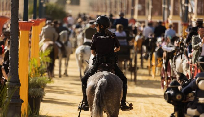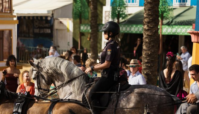Cruz Roja continúa su labor mientras, al otro lado del Real, una yegua deja su huella en el albero. En su lomo se divisa una cara de las fuerzas del orden. Inma lleva casi siete años rondando las ferias desde la Unidad de Caballería de la Policía Nacional, que se suma a las Unidades de Prevención y Reacción (UPR) de Jerez, El Puerto, Sanlúcar y Cádiz y las Unidades de Intervención Policial (UIP), más los agentes de paisanos.