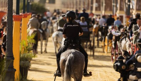 A caballo o a pie, la Policía Nacional está muy presente en el Real. No quita ojo a lo que pasa a su alrededor y se mantiene alerta, con todos los sentidos puestos en la masa de gente que se lo pasa en grande entre catavinos y volantes.