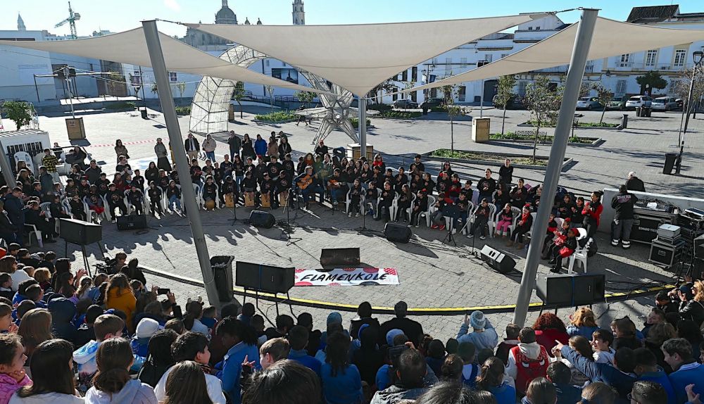 La plaza Belén se ha convertido este miércoles en un gran escenario educativo y cultural con la celebración de ‘Navidad con Flamenkolé’, una actividad municipal que ha reunido a más de ochocientos alumnos y alumnas de Jerez en torno a una Zambomba típica jerezana.