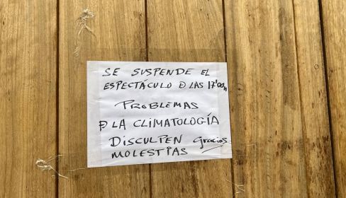 Un cartel colocado esta mañana en la puerta de la Sala Compañía de Jerez, escrito a mano con rotulador, anunciaba que "se suspende el espectáculo de las 17 horas. Problemas de la climatología. Disculpen las molestias. Gracias”.