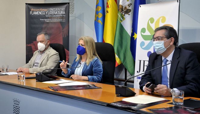 La alcaldesa de Jerez, Mamen Sánchez, acompañada de Antonio Pulido, presidente de la Fundación Cajasol, y José María Pérez Monguió, vicerrector de Cultura de la Universidad de Cádiz, ha presentado el Primer Encuentro Flamenco y Literatura que tendrá lugar del 26 al 30 de abril en el Teatro Cajasol.