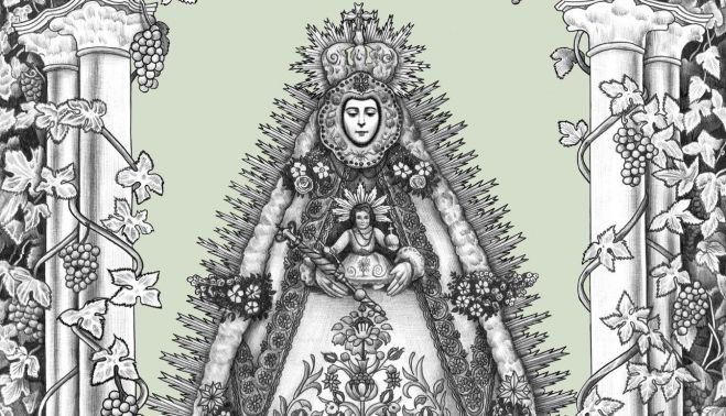 A su alrededor, la carreta de Jerez, el campo y las bodegas “se funden en un abrazo hacia ella elevándose hasta convertirse en un retablo para acogerla”. Este trabajo está realizado con bolígrafo y sobre papel -60x40cm-, una técnica que el artista asegura que “no concede tregua: no admite veladuras ni rectificaciones generosas. Cada sombra, cada textura, cada detalle del manto, cada hoja y cada racimo nacen de la paciencia, del pulso y de la exigencia”.