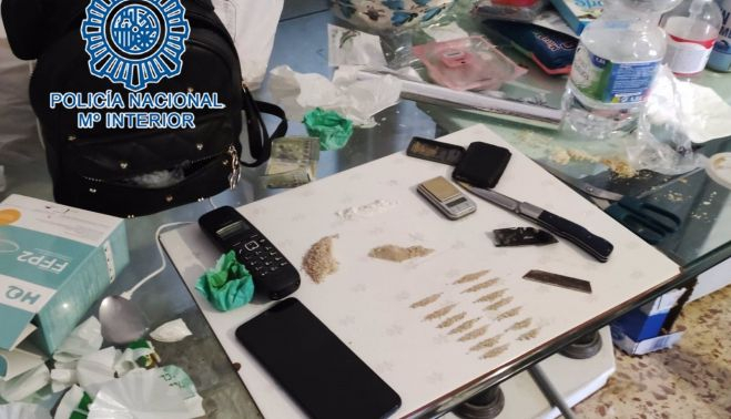 De esta forma los agentes localizaron en el salón del inmueble una reseñable cantidad de heroína que en esos mismos instantes estaba siendo mezclada con otras sustancias de corte por los arrestados, además se incautaron de distintas cantidades de cocaína, útiles para la manipulación de las sustancias, balanzas de precisión, dinero en metálico fraccionado en billetes y monedas de distinto valor para facilitar la venta, así como tres armas blancas, dos navajas y un cuchillo de cocina, dos de estas últimas de gran tamaño y longitud de hoja.