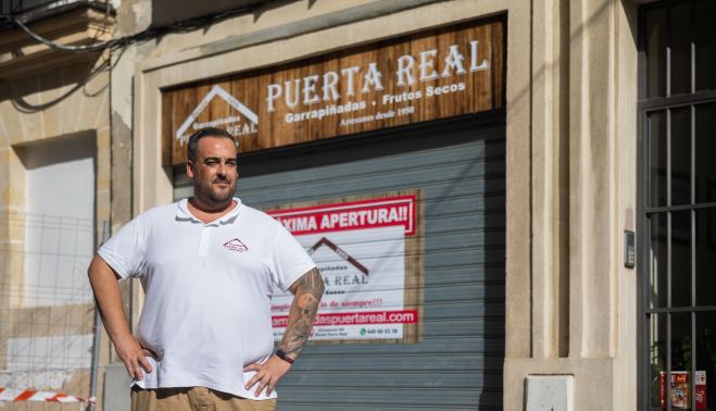 La apertura está pendiente de las obras y de los permisos municipales correspondientes. Ahora solo se ve un local con reja echada y un cartel en su parte superior ‘Puerta Real: garrapiñadas y frutos secos’. No obstante, “queremos abrir para octubre coincidiendo con la Magna o para navidades”.