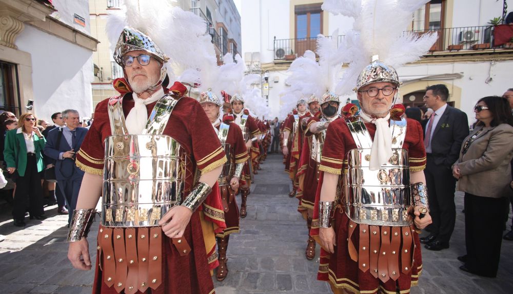 Las calles de Jerez han vivido uno de los momentos más singulares de este Domingo de Ramos. La Guardia Romana ha llevado a cabo su esperado pasacalles. El recorrido arrancaba a las 16:00 horas desde los Claustros de Santo Domingo, lugar donde los unfiormados han dado sus primeros pasos. Desde allí han dado una vuelta por el centro. alle Larga, Lancería, Plaza del Arenal o Consistorio, continuando por Plaza de la Yerba, Conde Cañete del Pinar, Plaza Plateros y Tornería.