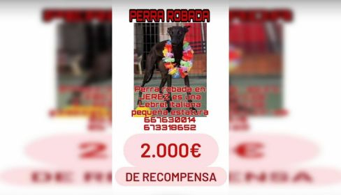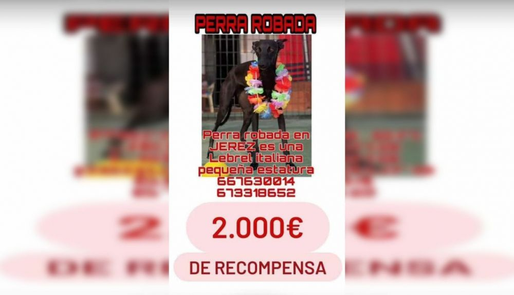 Hasta dos mil euros de recompensa ofrece Fran Morilla para quien encuentre a Bimba, la galga italiana que fue robada hace once días en Guadalcacín, entidad local autónoma de Jerez.