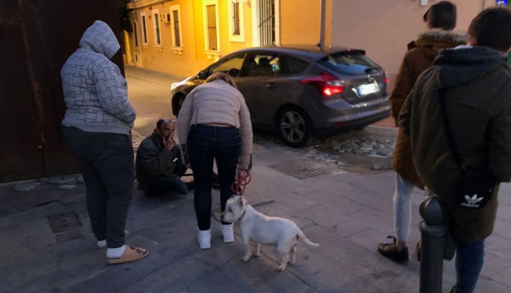 Un hombre tropieza por el deterioro del enlozado de las calles Juan Sánchez con Puerto, y tiene que esperar en el suelo a que llegue asistencia sanitaria desde Trebujena.